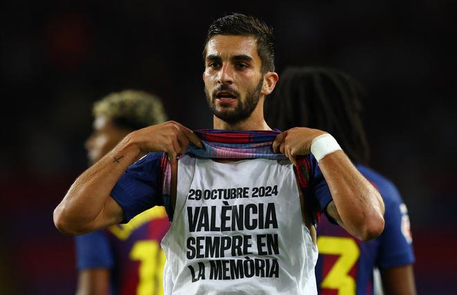 在進(jìn)球之后,費(fèi)蘭-托雷斯掀起了自己的球衣,并露出了背心正面的印字,上面寫著:“2024年10月29日,永遠(yuǎn)銘記瓦倫西亞?!?/p>